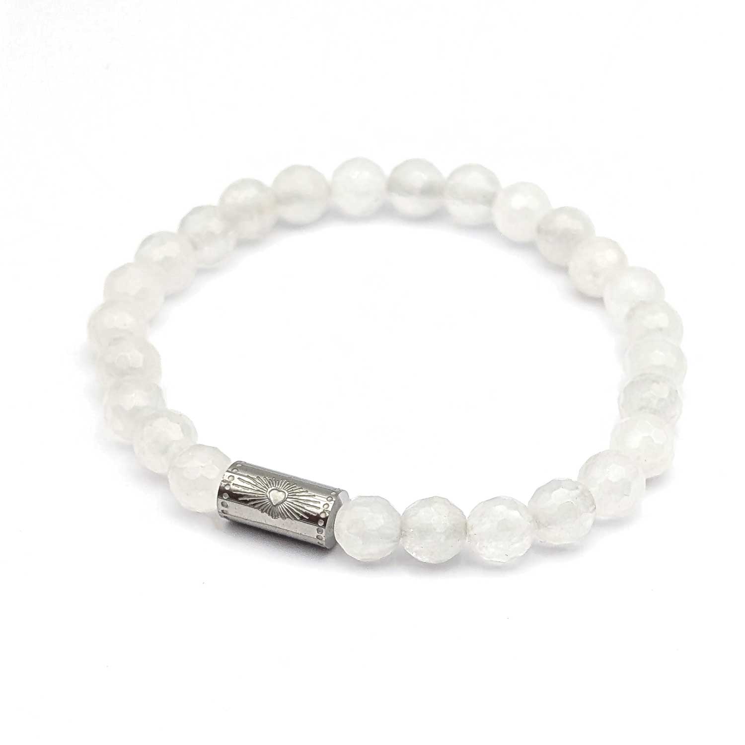 Ce bracelet est composé de perles facettées de 6mm en cristal de quartz et d'une perle centrale en acier inoxydable avec soit une étoile ou un coeur. A vous de choisir le symbole. Le bracelet est monté sur un élastique très résistant et durable.