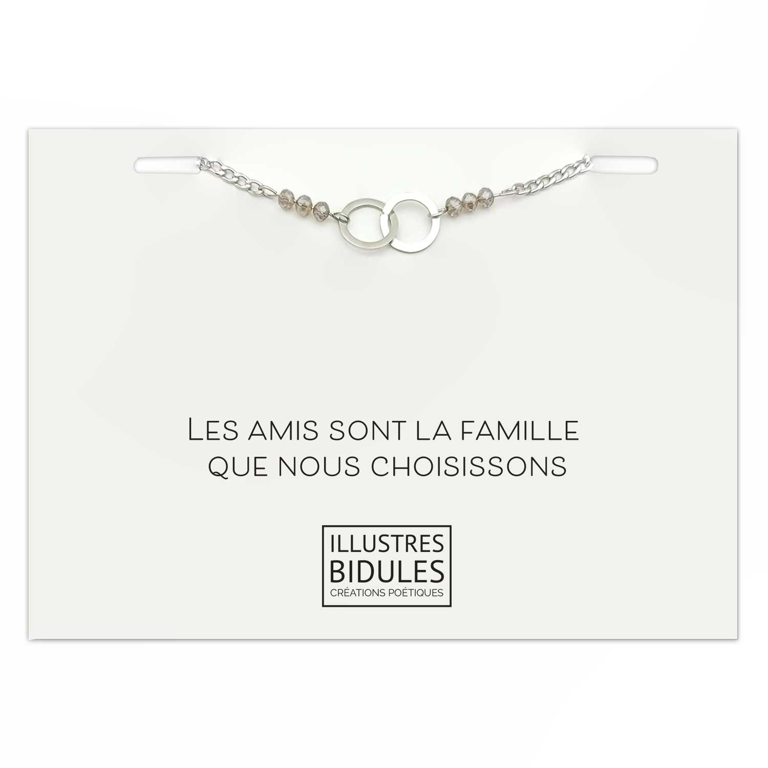 Joli bracelet en acier inoxydable argenté avec une breloque en forme de double anneau accompagné d'une jolie citation : « Les amis sont la famille que nous choisissons ».