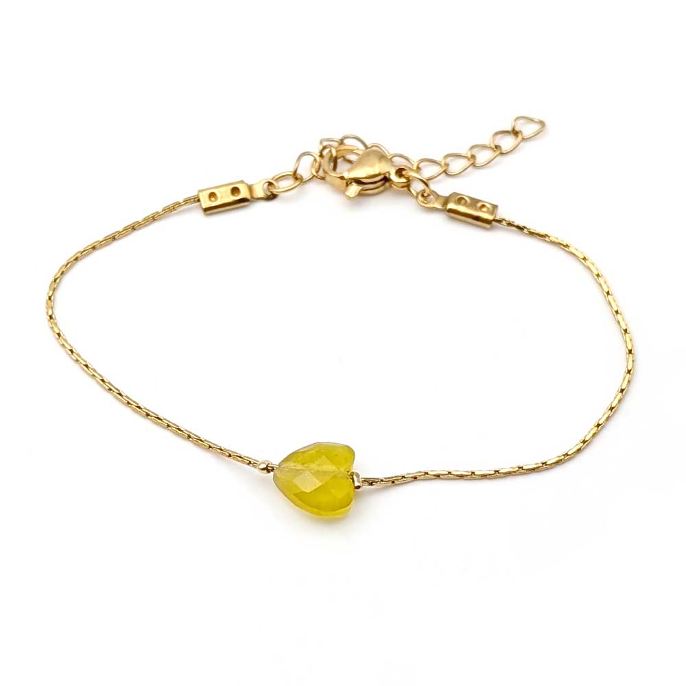 Bracelet Isadora cœur en jade jaune, en acier inoxydable doré, avec une petite perle facettée en forme de cœur. Un bijou minimaliste, lumineux et facile à porter au quotidien.