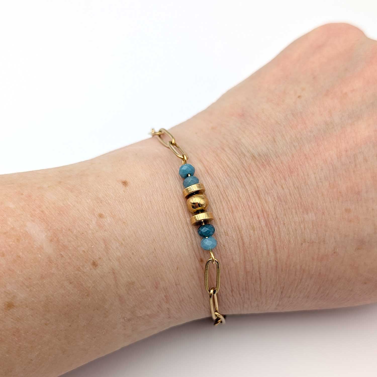 - Petite perle à facette en jade teintée bleue (La pierre étant un produit naturel, les couleurs et les nuances peuvent varier d'un bracelet à l'autre)