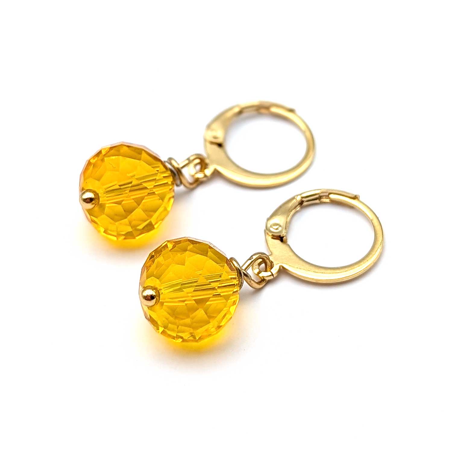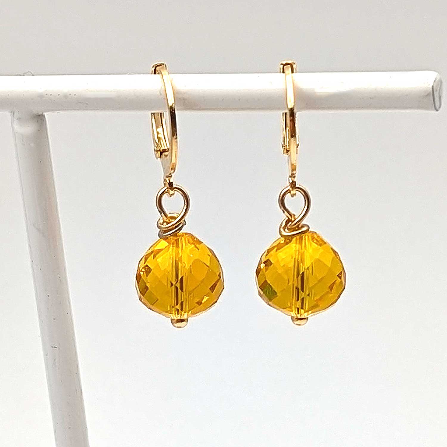 Boucles d'oreilles dormeuses en acier inoxydable doré avec perle à facette en verre de Bohême de couleur miel. Elles font partie de la collection CANDY